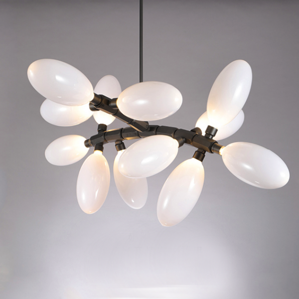 Каждая люстра состоит из большого количества плафонов нанизанных на алюминиевые подвижные позвонки. Что дает возможность видоизменять люстру, давать ей естественное ниспадание. Каждый плафон выдувается вручную - что дает особенное, в полном смысле этого слова, неповторимое,  изящество.