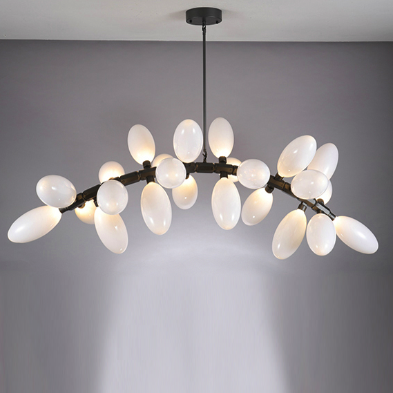 Каждая люстра состоит из большого количества плафонов нанизанных на алюминиевые подвижные позвонки. Что дает возможность видоизменять люстру, давать ей естественное ниспадание. Каждый плафон выдувается вручную - что дает особенное, в полном смысле этого слова, неповторимое, изящество.